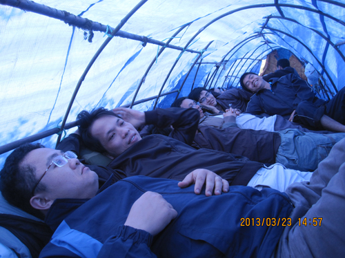 Cứ tưởng rằng được nằm nghỉ là đã yên thân, nhưng không như chúng tôi tưởng, nằm trong cái lều mà anh em trong trong đoàn gọi với cái tên thân mật là “chuồng trâu”. Trên người mặc thêm mấy cái áo rét, cộng thêm túi ngủ bên ngoài mà lưng vẫn lạnh. Đã thế lại một “dàn hợp xướng” của các anh thợ xẻ bên tai. Ngoài trời gió rít từng cơn đập vào lều, kèm theo tiếng sương rơi cứ như đang có giông bão. Thi thoảng lại có giọt nước rơi vào mặt, không sao ngủ được chỉ ước cho trời mau sáng.