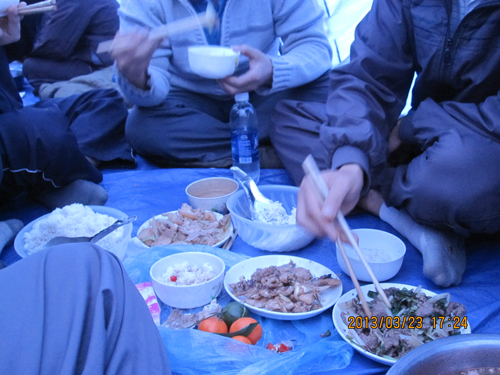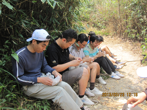 Đến 10h30 chúng tôi đến trạm dừng chân ở độ cao 2200m, do còn sớm nên cả đoàn thống nhất bỏ qua và tiếp tục leo đến 11h30 mới nghỉ chân. Chờ mất khoảng 30p mới thấy mấy anh Poster mang cơm đến nơi(có vẻ mấy anh Poster hơi yếu :D), bữa trưa của chúng tôi với thực đơn chính là cơm nắm - muối vừng, thịt rang và chuối tráng miệng. Do đói và khát nên anh/chị em nào cũng ăn no kễnh bụng .