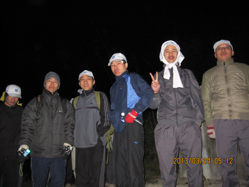 4h30’ anh hướng dẫn gọi cả đoàn dậy. Cả đoàn nhanh chóng dung bữa sáng với mỳ tôm hai trứng và một cốc trà gừng. Hành trình từ 2.800m lên đỉnh Fansipan của chúng tôi gặp khó khăn vì trời còn tối khuya, mọi người phải rọi đèn pin để bước từng bước một. Có những đoạn toàn là những tảng đá to, phải trèo qua rất vất vả, đường đã khó đi, nhưng bù lại chúng tôi lại được ngắm cảnh bình minh rất đẹp.